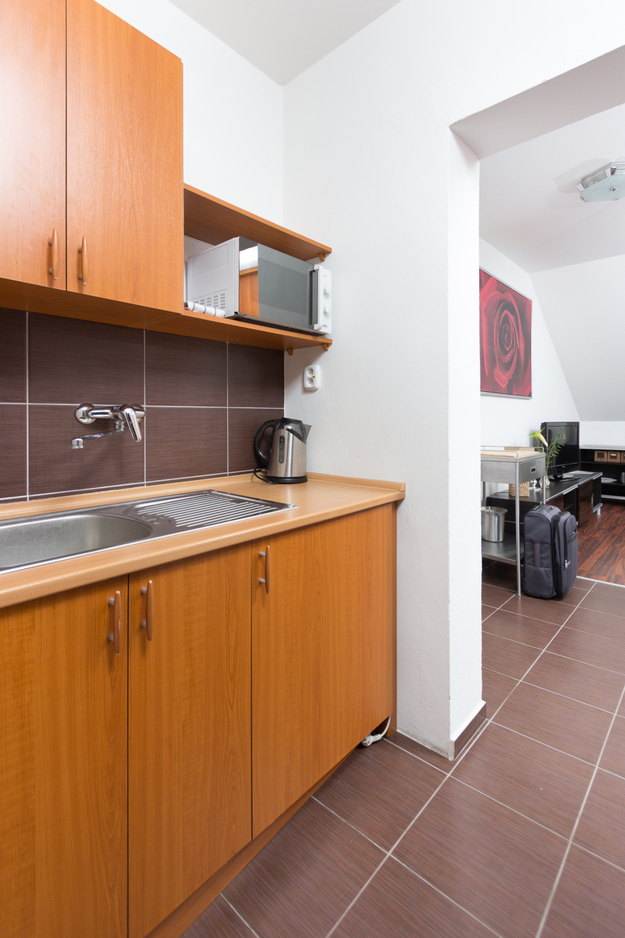 Kuchyňka -chladnička, mikrovlnná rúra, rýchlovarná kanvica, inventár